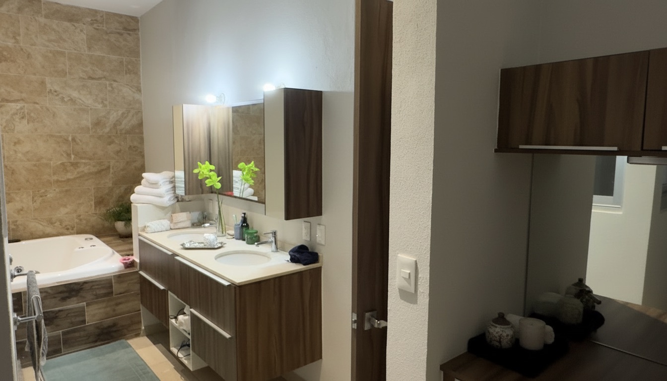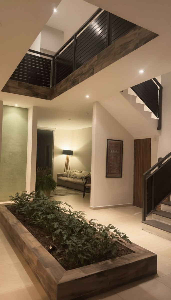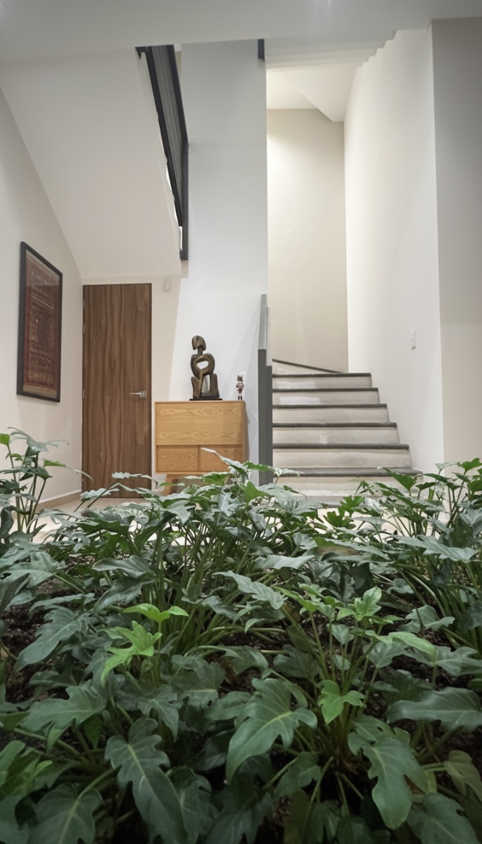En planta baja cuenta con baño de visitas, sala y comedor de excelente tamaño, sala de TV, y cocina equipada. Se complementa con bodega, jardín privado con medio baño adicional, pasillo de servicio con acceso independiente, cuarto de servicio con baño completo y zona de lavado (lavadora/secadora), aportando practicidad y una operación cotidiana eficiente.